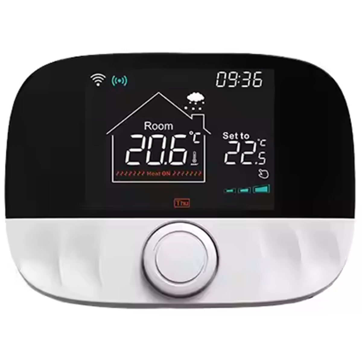Centralka komunikuje się z termostatami zawartymi w zestawie za pomocą sygnału RF 433MHz, nie łączy się do Wifi.