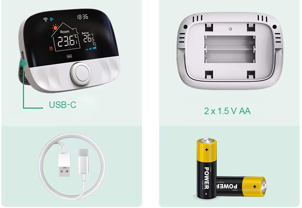 - Zasilanie termostatu: USB-C / 2x Bateria AA (Brak w zestawie)