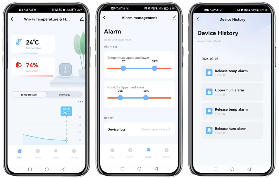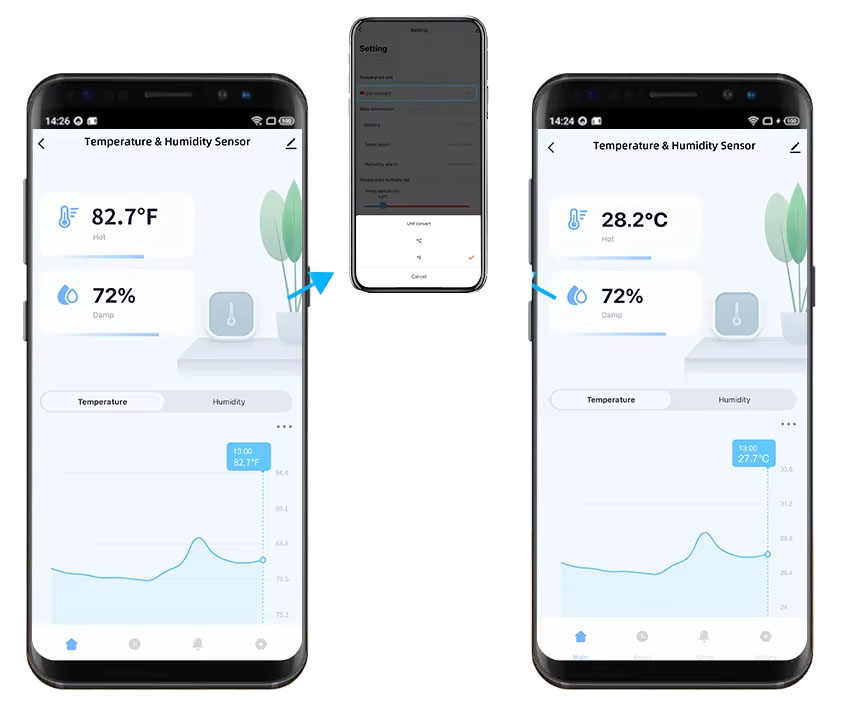 - Sprawdzaj temperaturę i wilgotność w dowolnym miejscu i czasie za pomocą aplikacji mobilnej na Android / iOS.