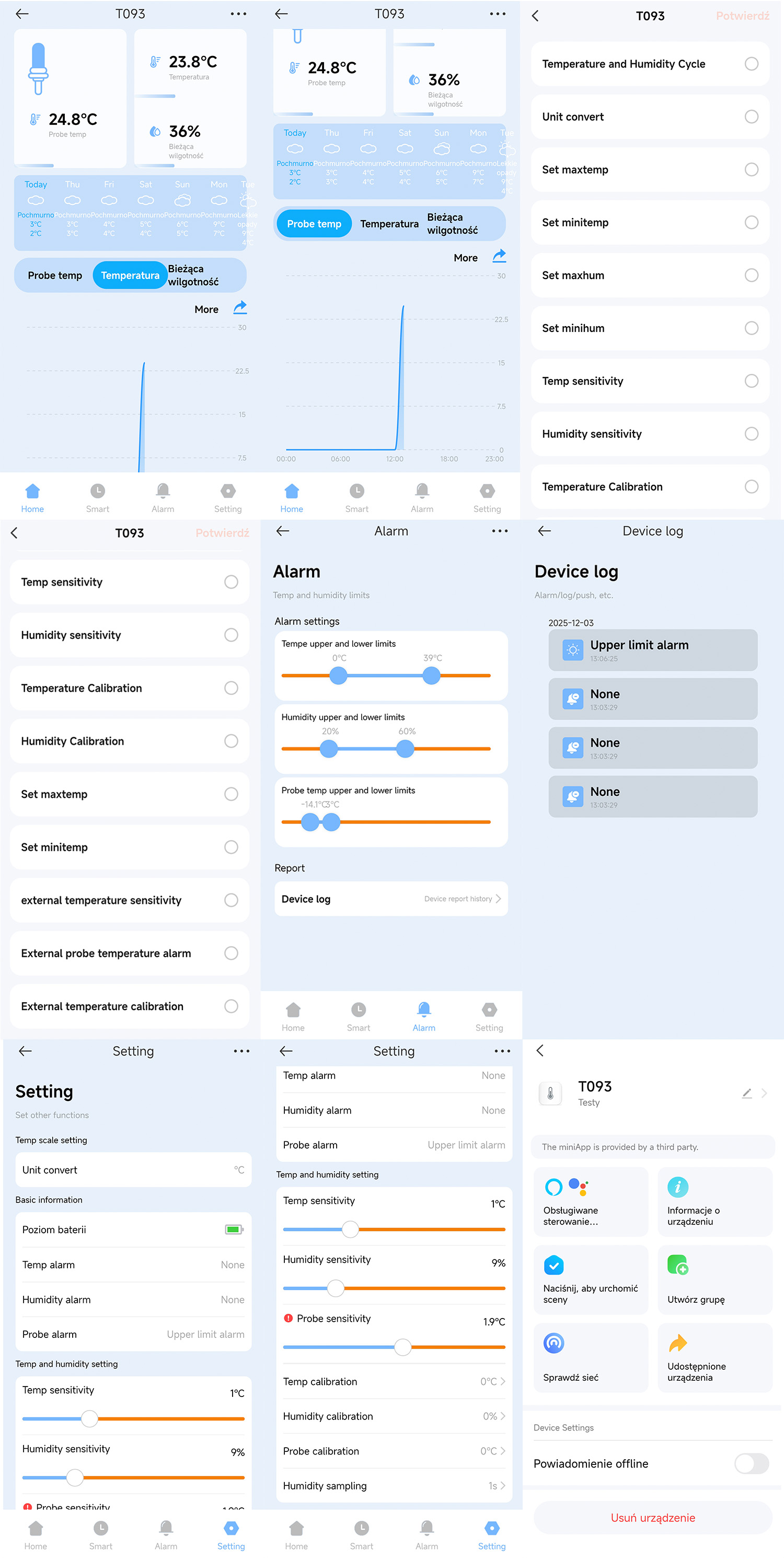 - Funkcje: Pomiar temperatury (sonda + sensor wbudowany), wilgotność, prognoza pogody, alarmy, statystyki, automatyzacja, historia danych