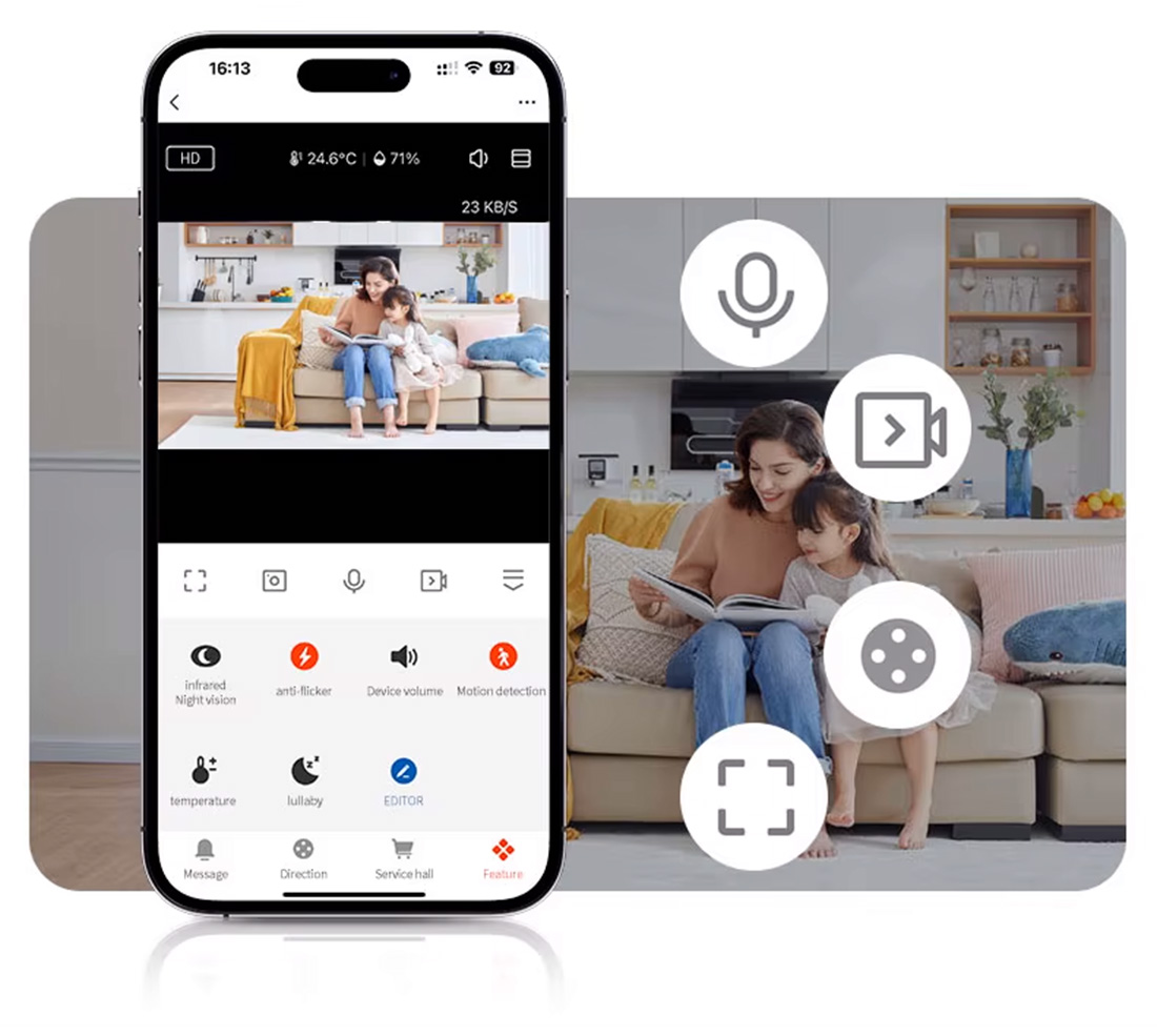 - ✅ Dwustronny dźwięk – rozmawiaj z dzieckiem przez kamerę