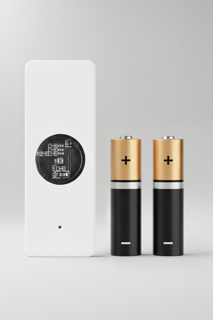 Zasilany 2 bateriami AAA, działa zwykle 3–6 miesięcy w zależności od częstotliwości raportowania.