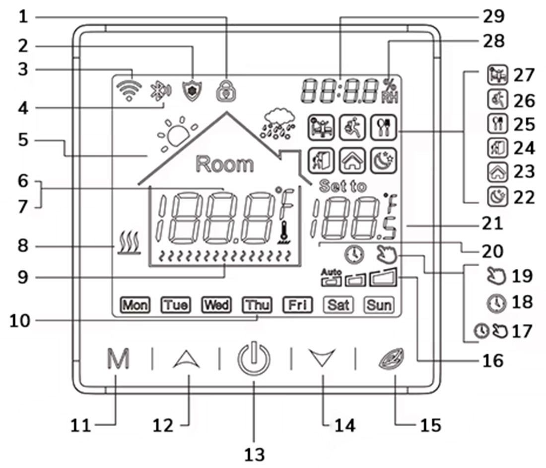 - 17-20. Tryb Tymczasowy / Auto / Manual / ECO