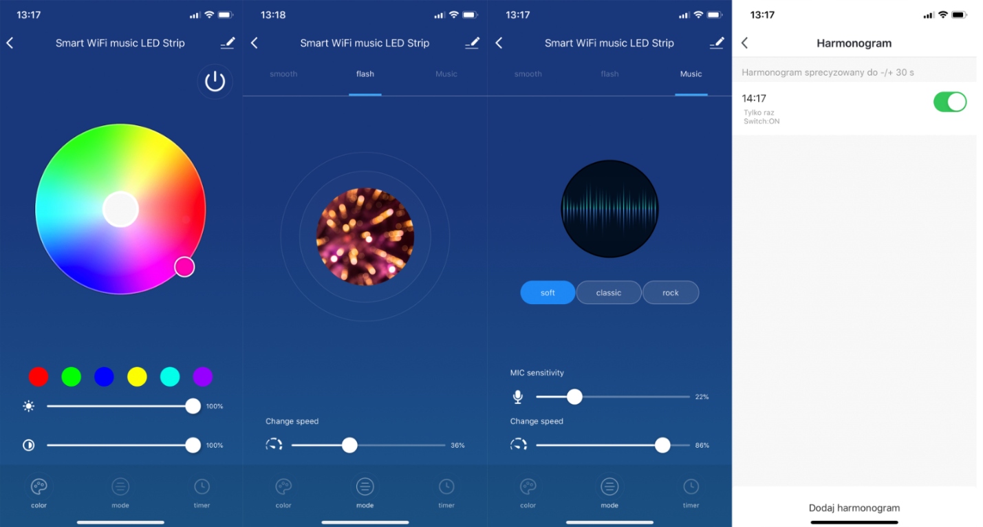 Tryb zmiany kolorów i natężenia oświetlenia w rytm muzyki światła zmieniają kolory i rytmicznie migają, dopasowując się w rytm muzyki. Możesz dopasować czułość i prędkość wedle uznania.