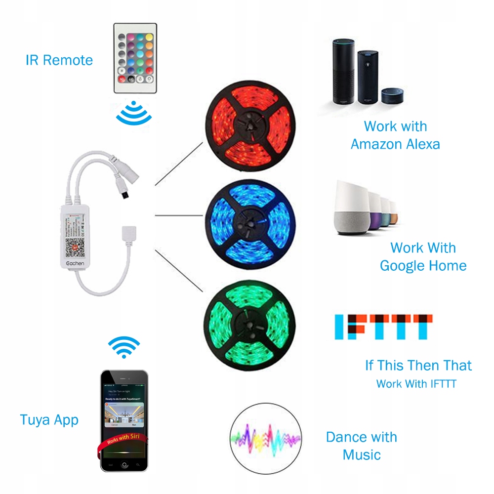 Możliwość sterowania taśmami LED z aplikacji TUYA SMART - jeden ekosystem z pozostałymi urządzeniami oraz sterowanie pilotem IR.