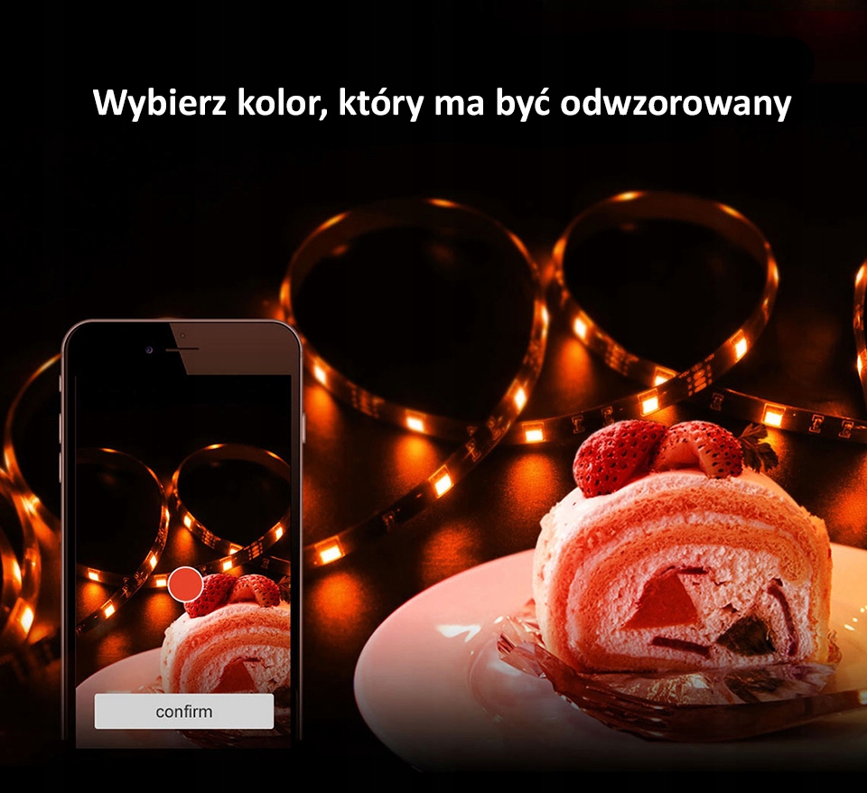 Tryb wyboru koloru z otoczenia poprzez aparat telefonu komórkowego. Wybierz kolor otoczenia potwierdź, a kontroler ustawi kolor taśmy LED na Twój wybór.