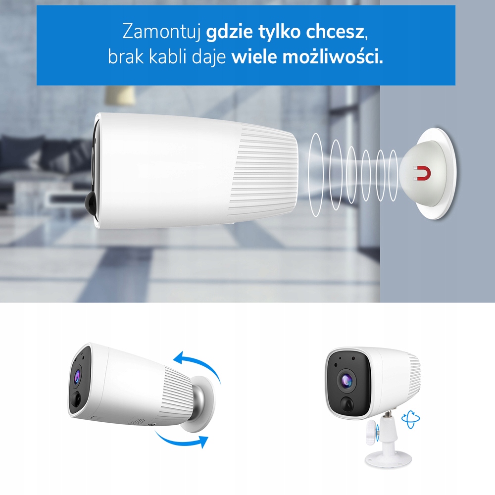 Dzięki brakowi okablowania jesteśmy w stanie zainstalować ją praktycznie wszędzie. Bardzo mocny magnes sprawia, że mocowanie kamery jest bardzo stabilne.