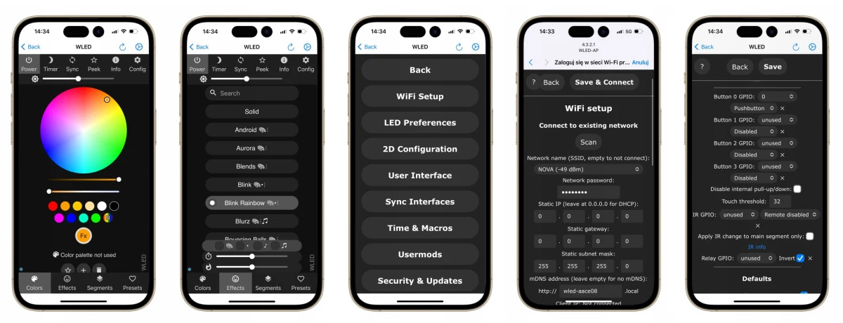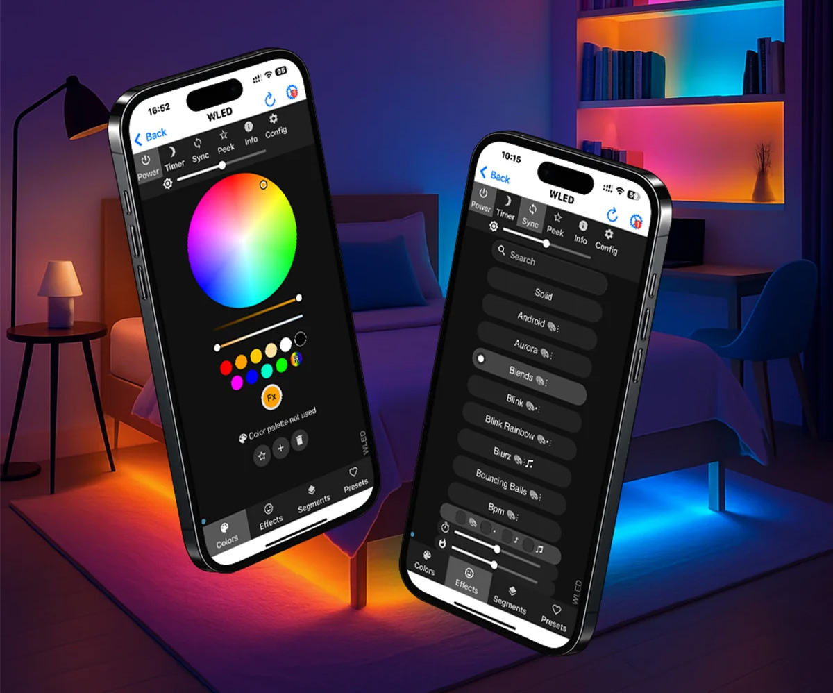 - Interfejs: Sterowanie przez aplikację mobilną WLED (Android/iOS) lub dowolną przeglądarkę internetową po wpisaniu adresu IP urządzenia.