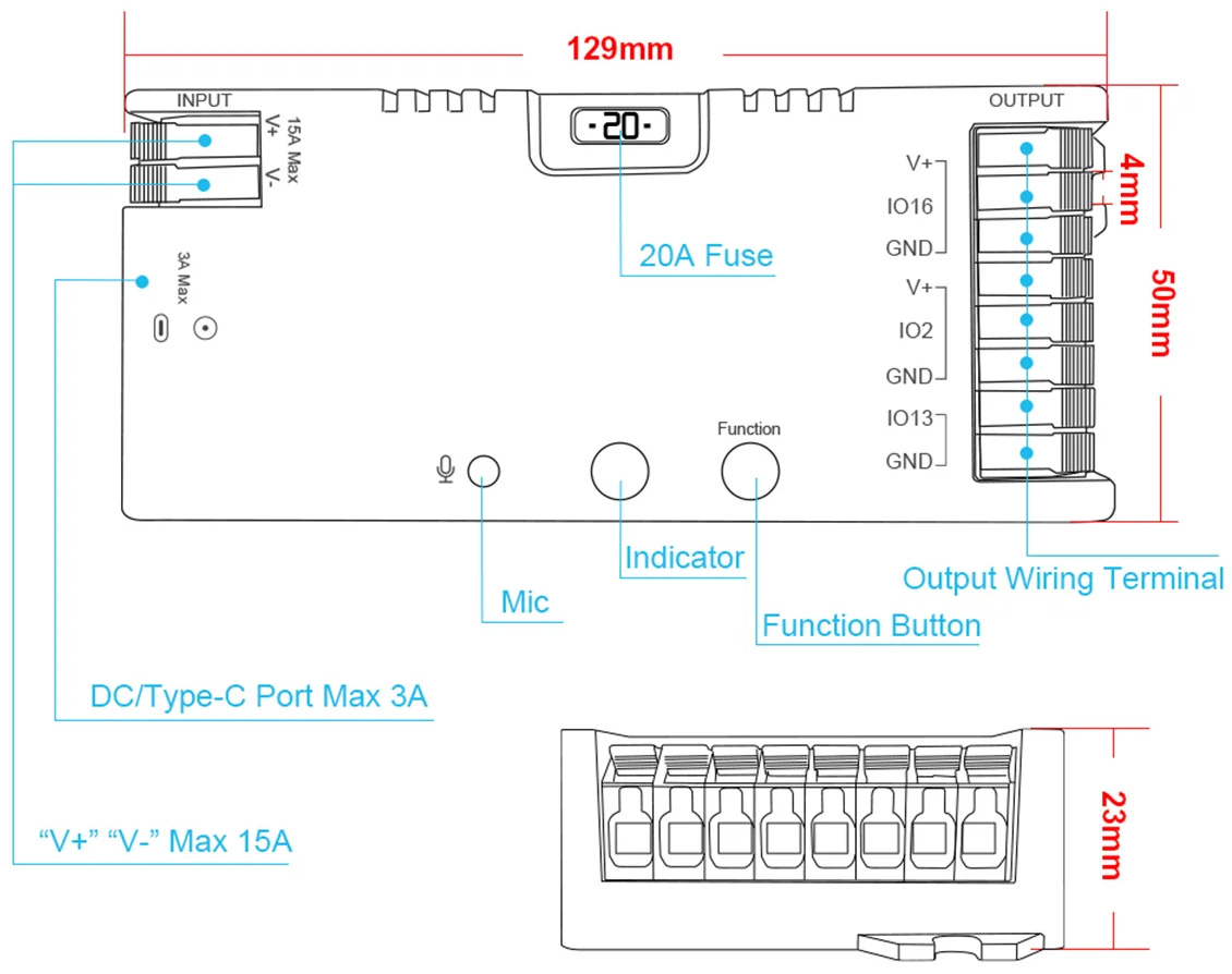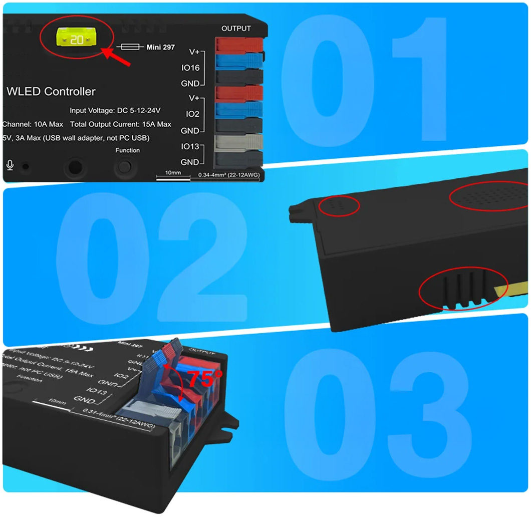 - Built-in Fuse (15A) – Wbudowany bezpiecznik, który chroni kontroler oraz Twoją instalację przed skutkami ewentualnego przeciążenia lub zwarcia.