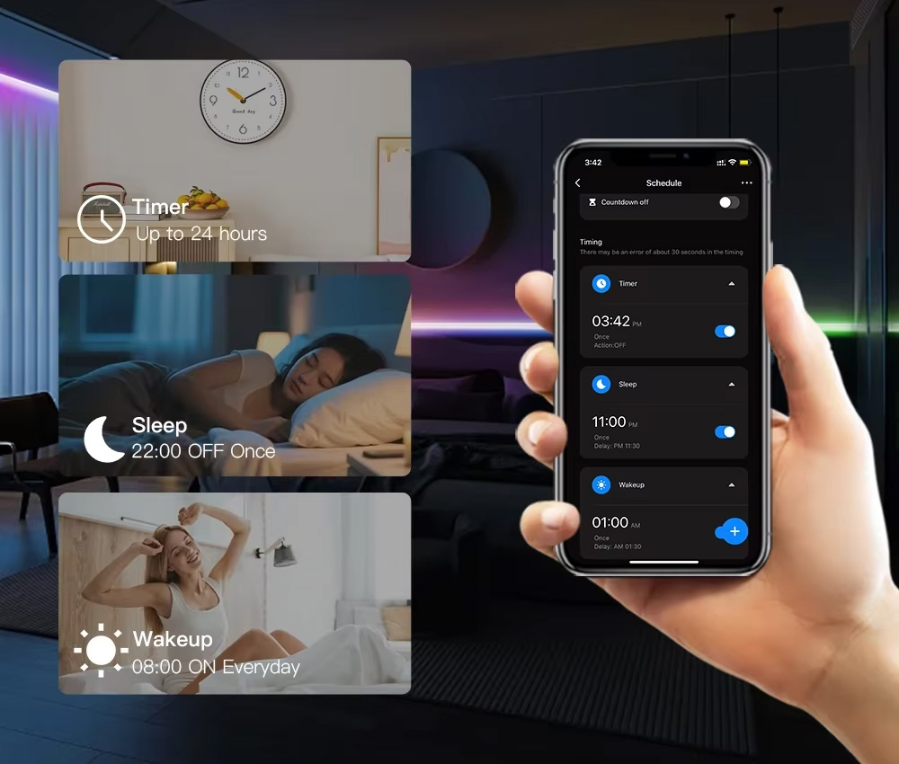 - Harmonogramy: Automatyczne włączanie/wyłączanie (np. o 8:00 lub 22:00).