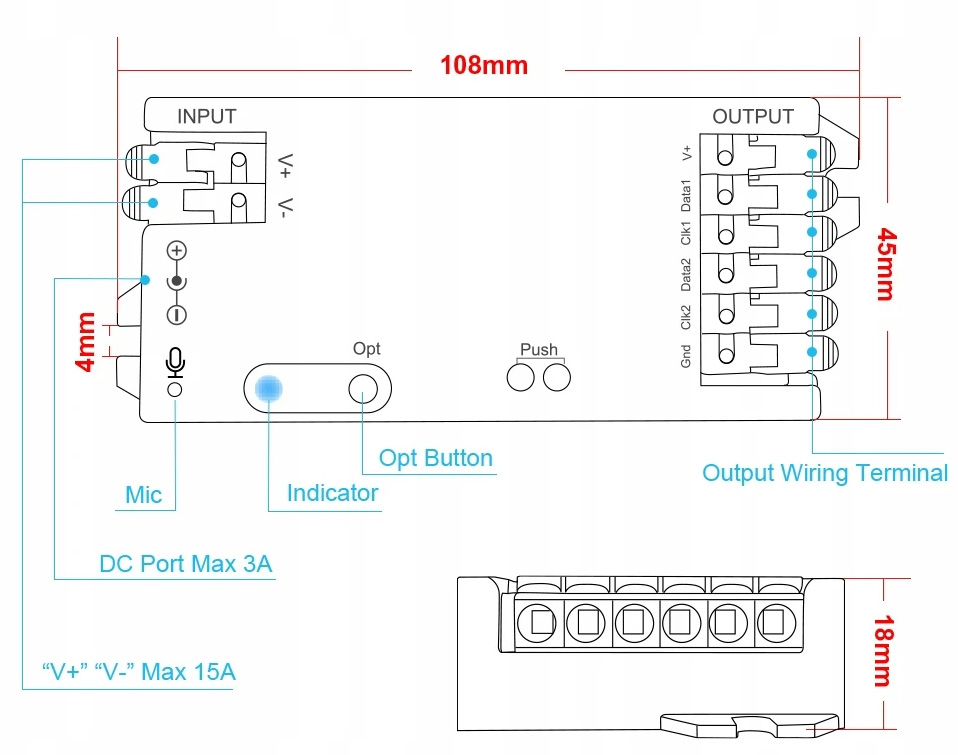 - Napięcie pracy: DC 5–12–24V (szeroki zakres napięć wejściowych)