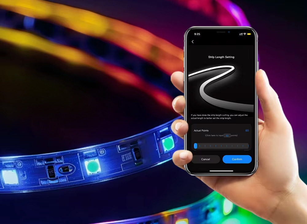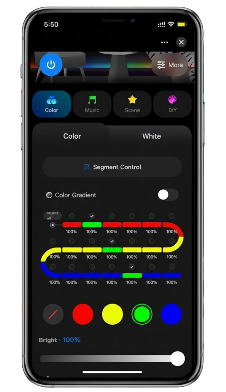 - Segment Control – Funkcja dzielenia taśmy na grupy, pozwalająca na tworzenie zaawansowanych scenariuszy świetlnych.