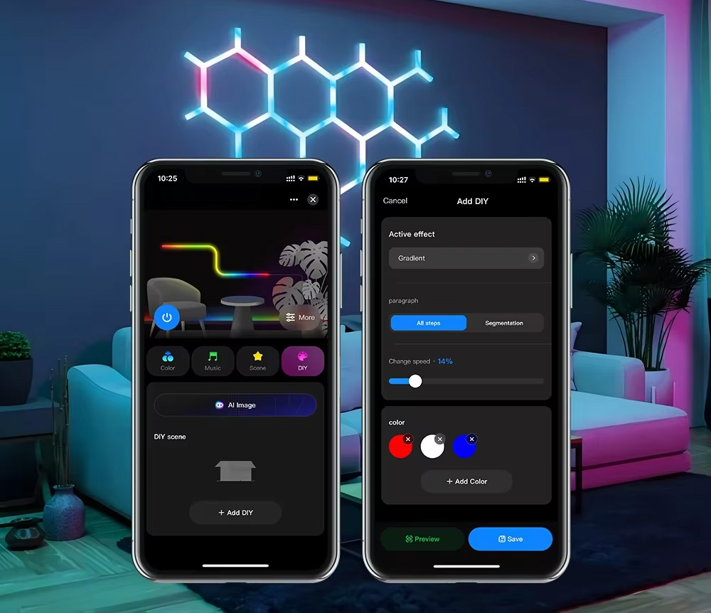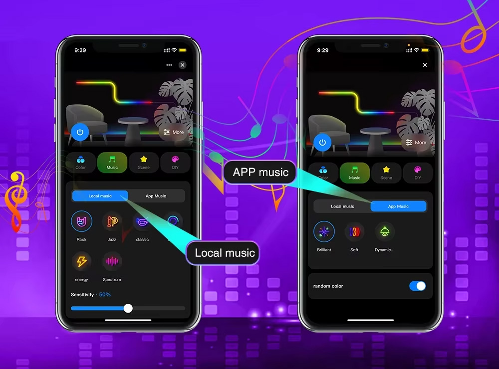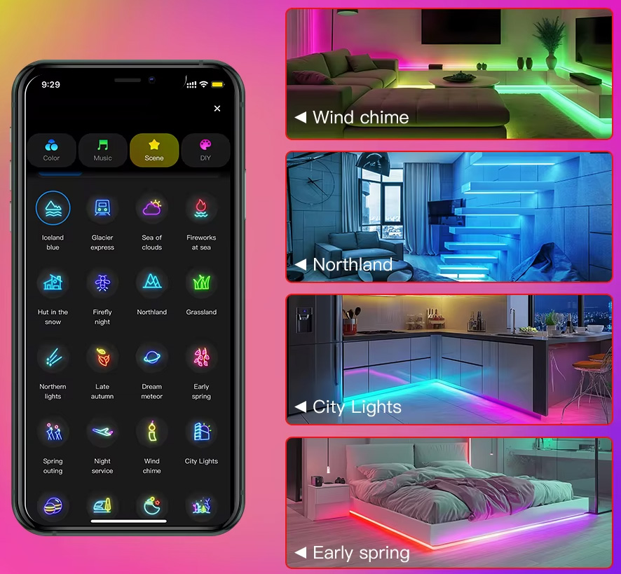- Tryby pracy: Harmonogramy, Timer, Synchronizacja z muzyką (wbudowany mikrofon), Sceny DIY, sterowanie grupowe