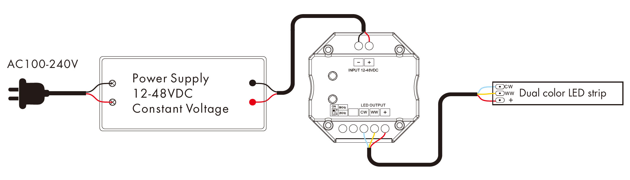 - ✅ Podłączenie: zasilanie 12–48 V DC oraz przewody do paska LED Dual Color