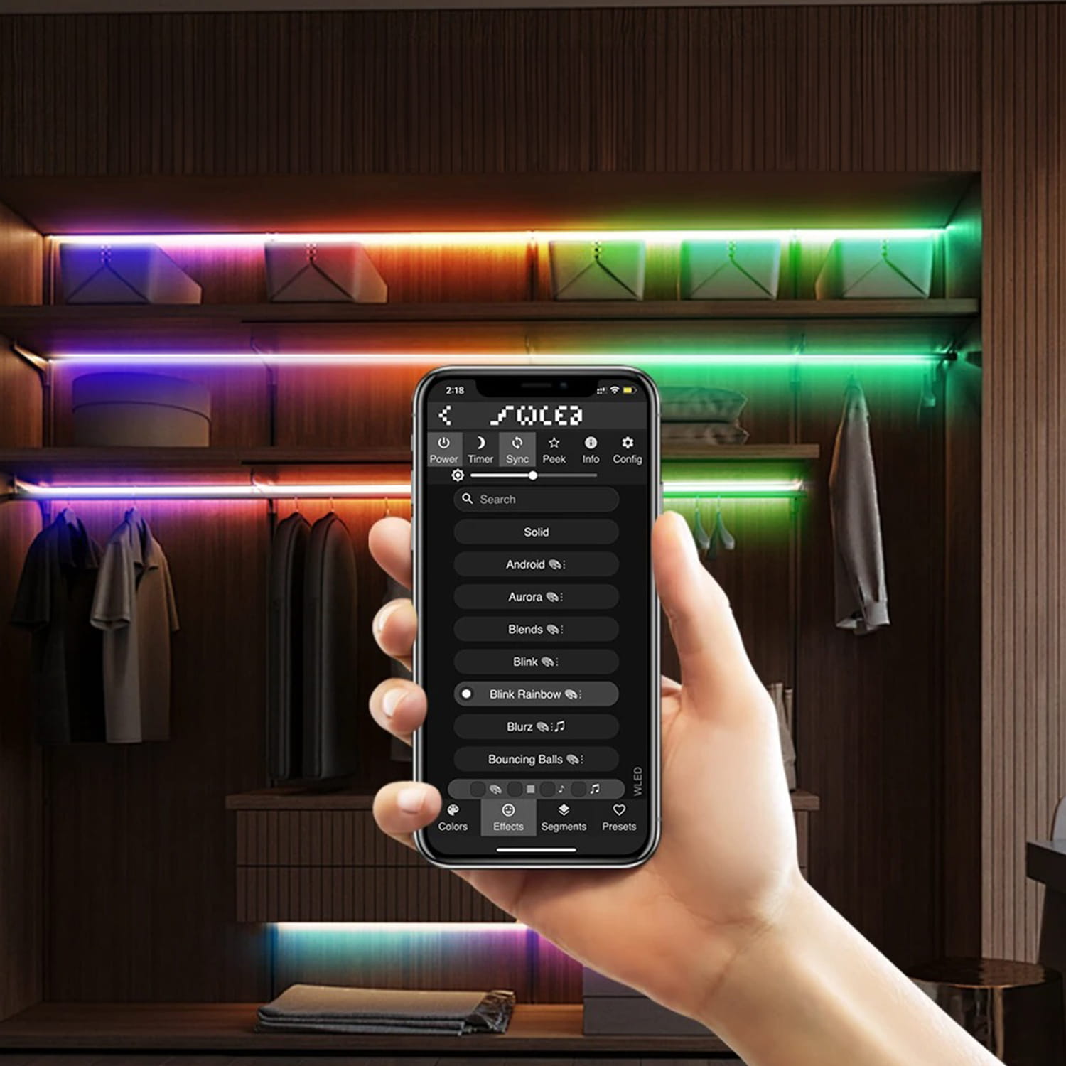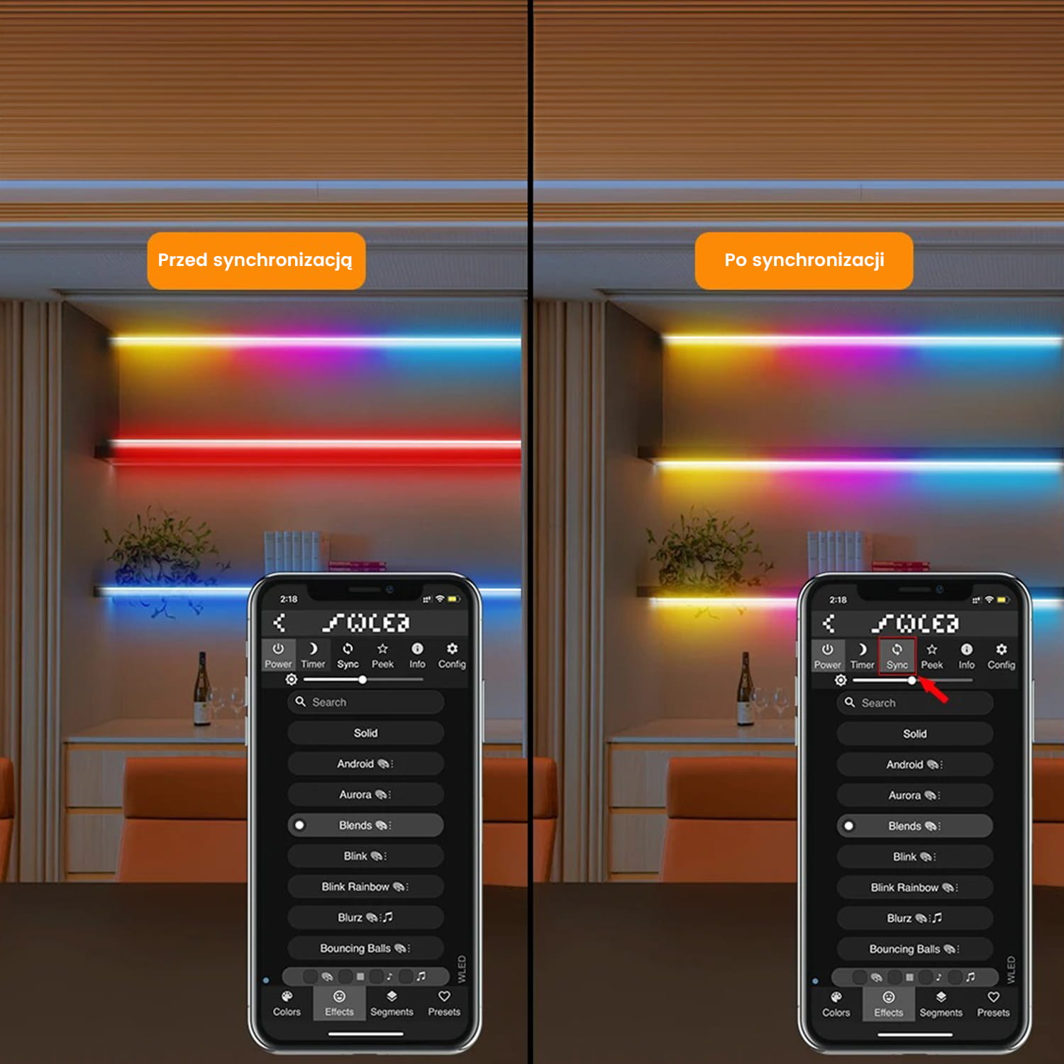 Zgraj swoje taśmy LED tak aby świeciły jednolitym światłem, w tym samym czasie i z tą samą dynamiką za pomocą jednego przycisku (Sync) w aplikacji WLED.