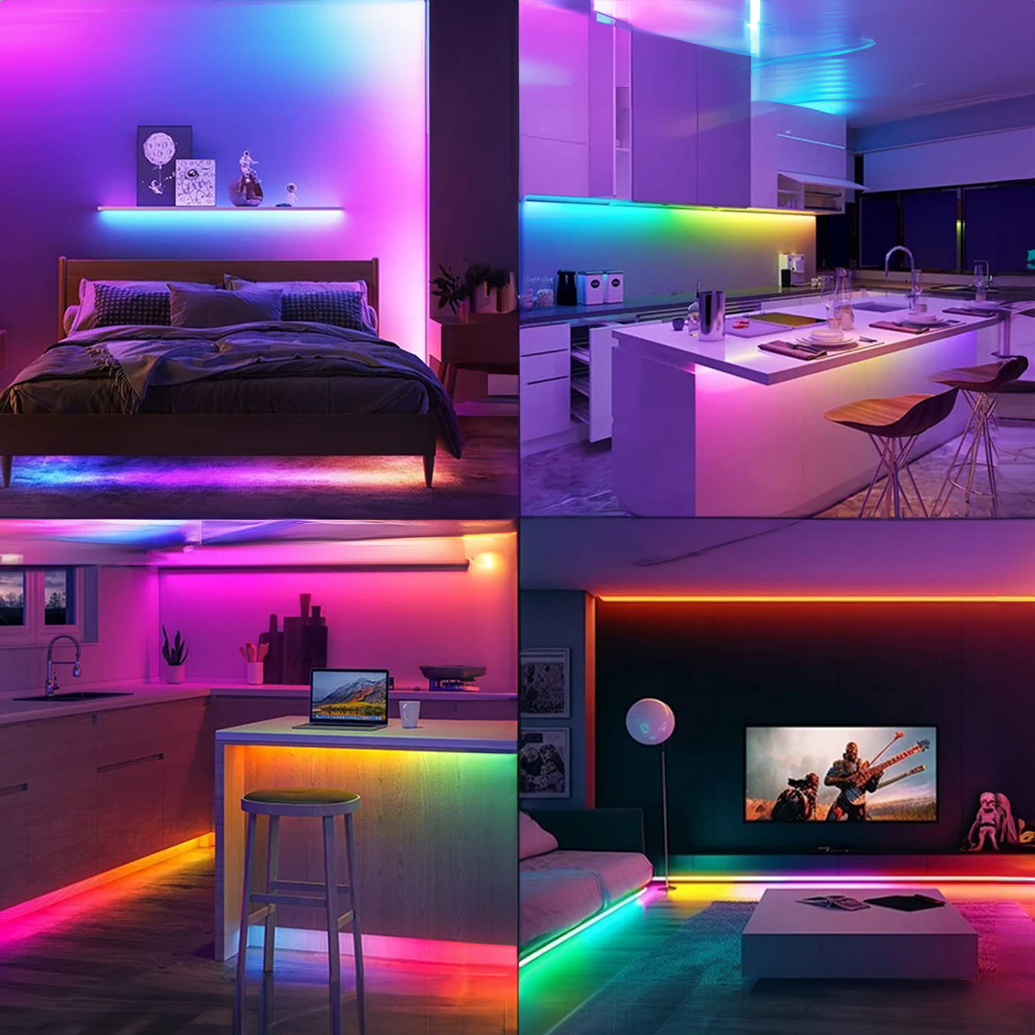 - RGBIC — kolory + regulowany biały (mieszane z kolorów) + ściemnianie — paski cyfrowe, w których każda dioda jest adresowana indywidualnie, co pozwala na uzyskanie efektów płynącego światła i dynamicznych programów oświetlenia