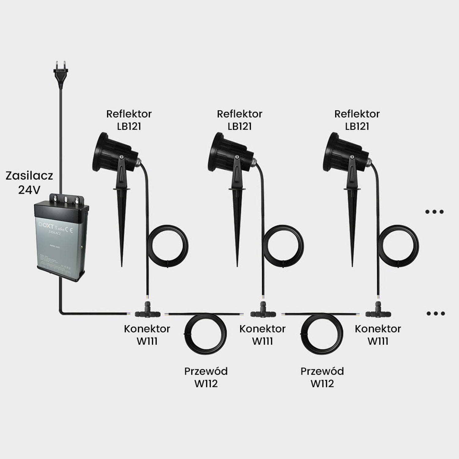 Przykładowo, zasilacz można połączyć z reflektorami ogrodowymi z serii GL.
