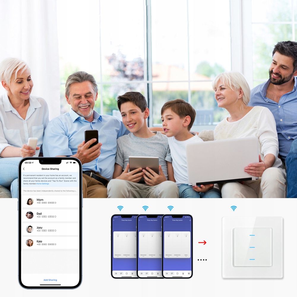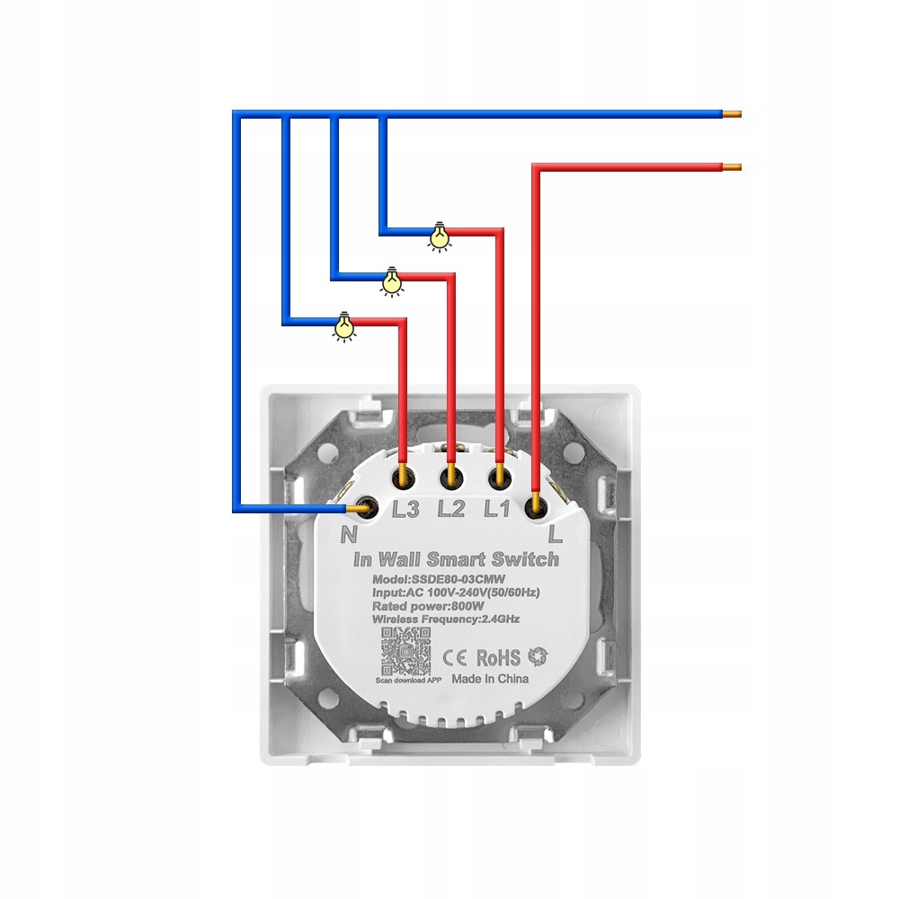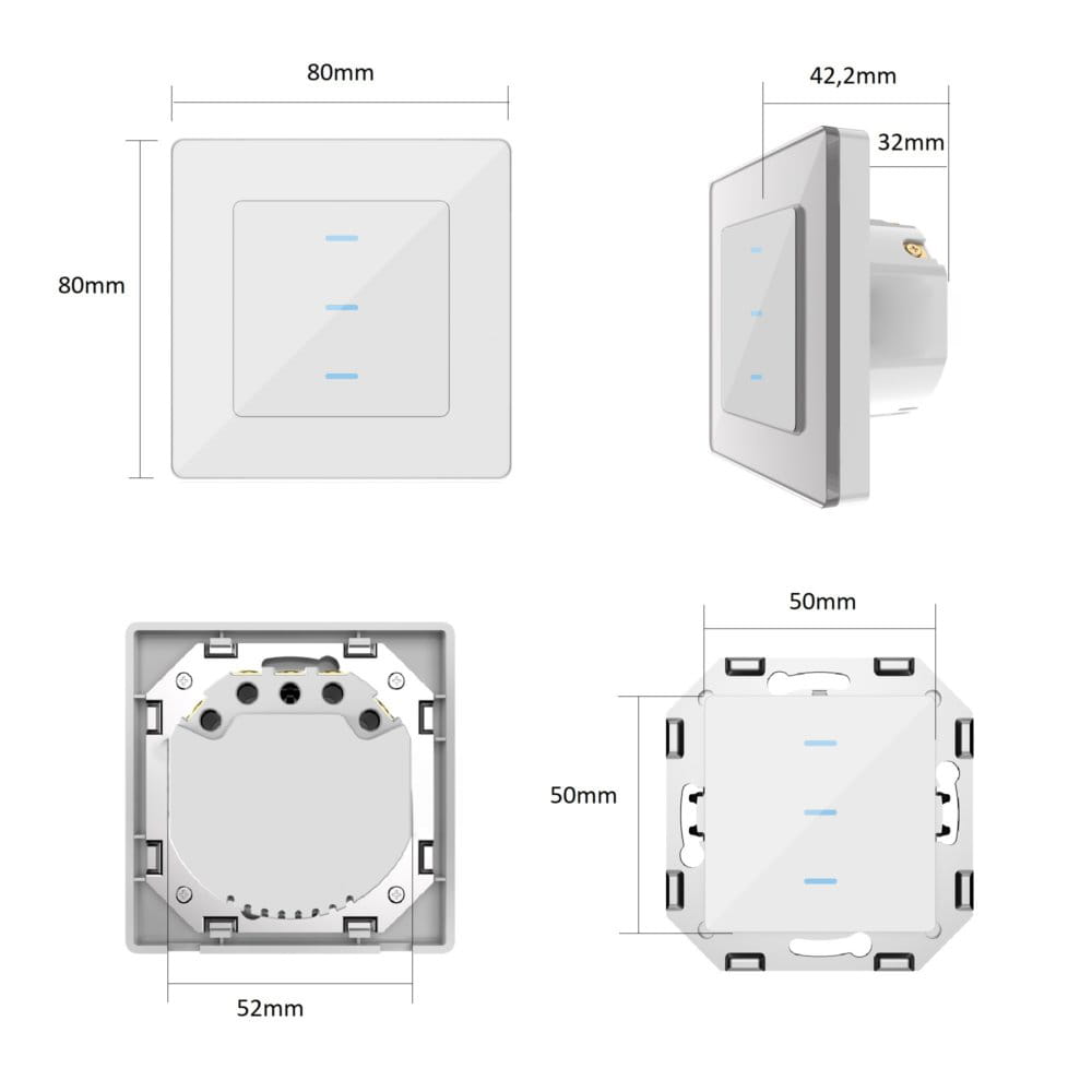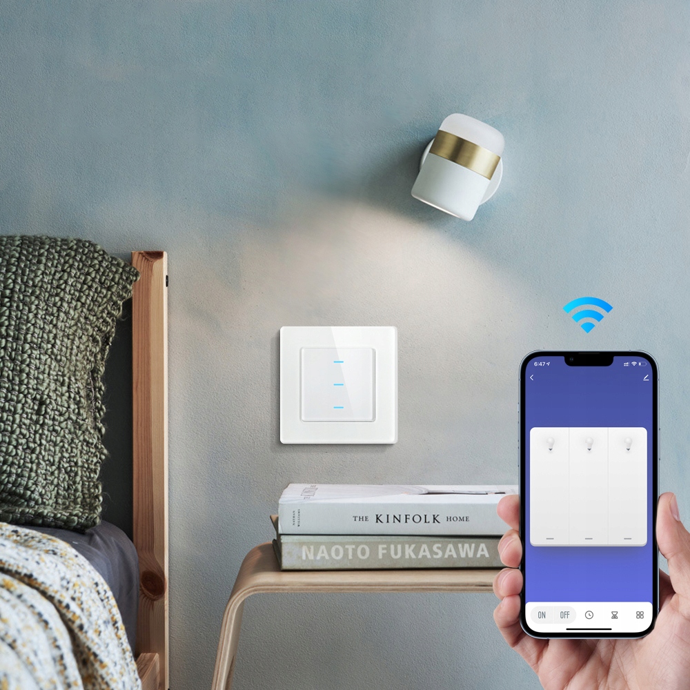 Inteligentny przełącznik ścienny jest przełącznikiem modułowym umożliwiającym użytkownikom zdalne włączanie / wyłączanie podłączonych trzech obwodów oświetleniowych z dowolnego miejsca na świecie: