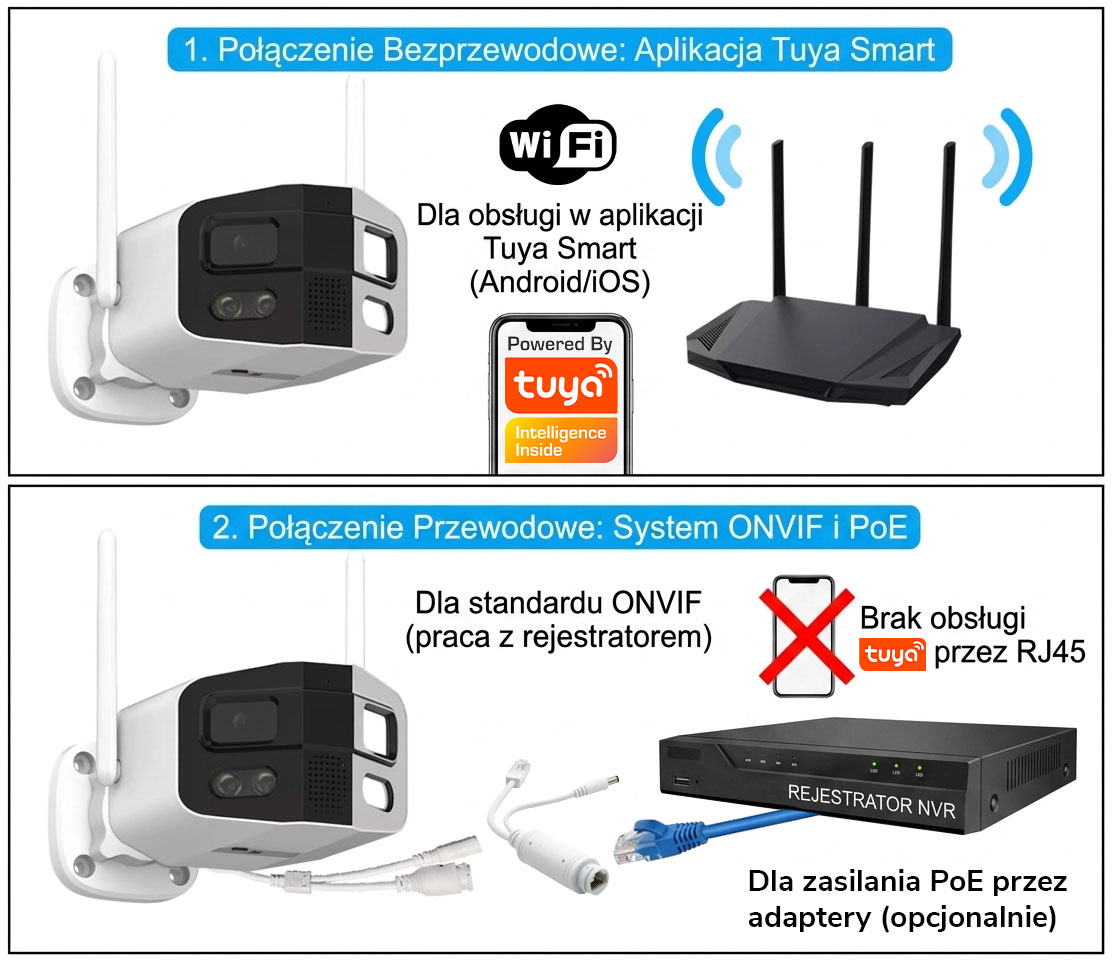 - Port RJ45: Obsługuje wyłącznie standard ONVIF (praca z rejestratorem) lub zasilanie PoE przez adaptery. Port ten nie zapewnia łączności internetowej dla pracy w aplikacji Tuya.