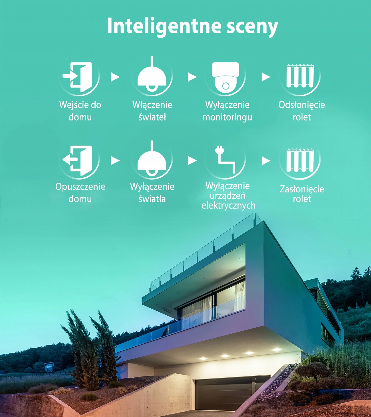 - Inteligentne sceny – kontrolowanie urządzenia na podstawie temperatury, wilgotności, czujnika ruchu, czujnika otwarcia drzwi/okien lub innych dostępnych czujników, twórz złożone scenariusze wiążące różne urządzenia w aplikacji.