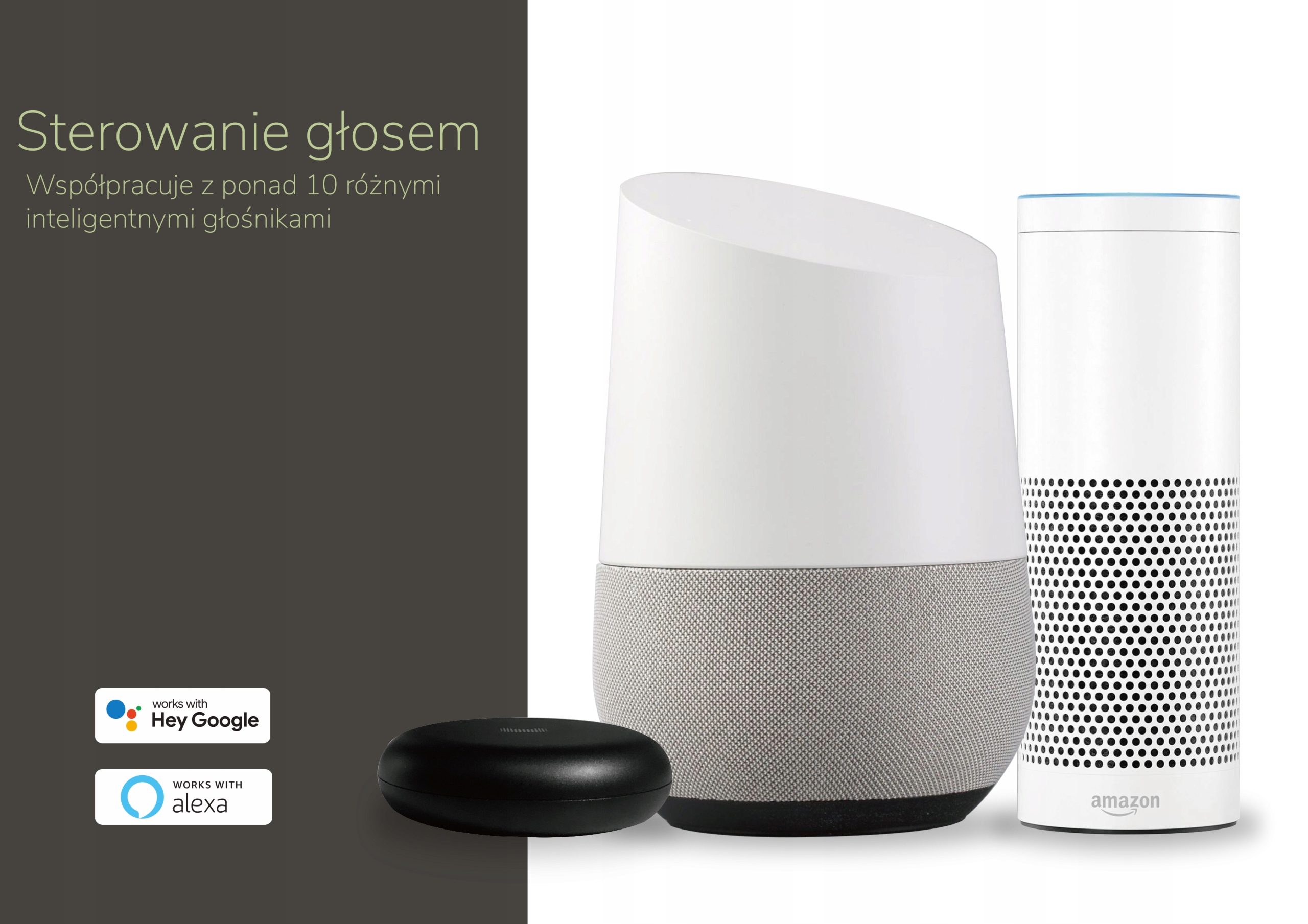 - Współpraca z asystentami głosowymi Google Assistant lub Amazon Alexa, Google Nest