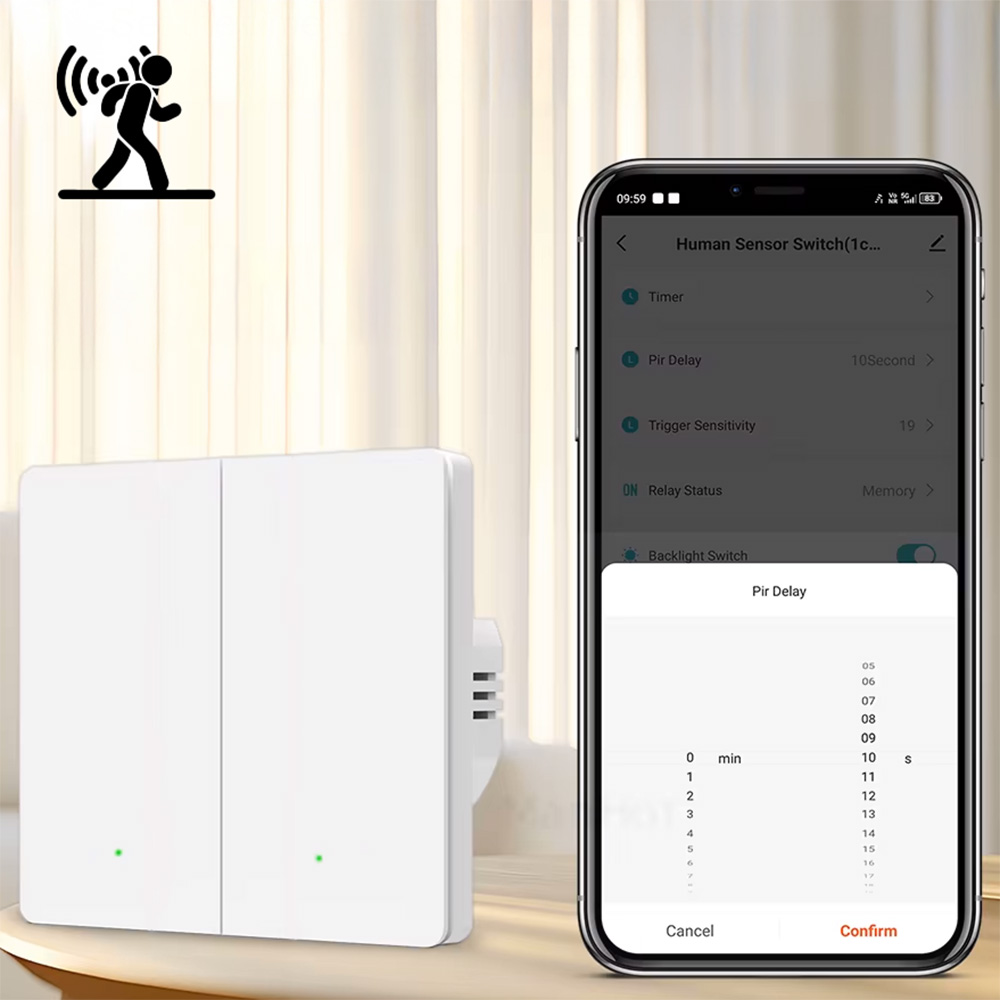 Czujnik w przełączniku wykorzystuje technologię radarową, która pozwala na wykrycie nawet najmniejszego ruchu. Zapewnia to większą czułość niż standardowe czujniki PIR.
