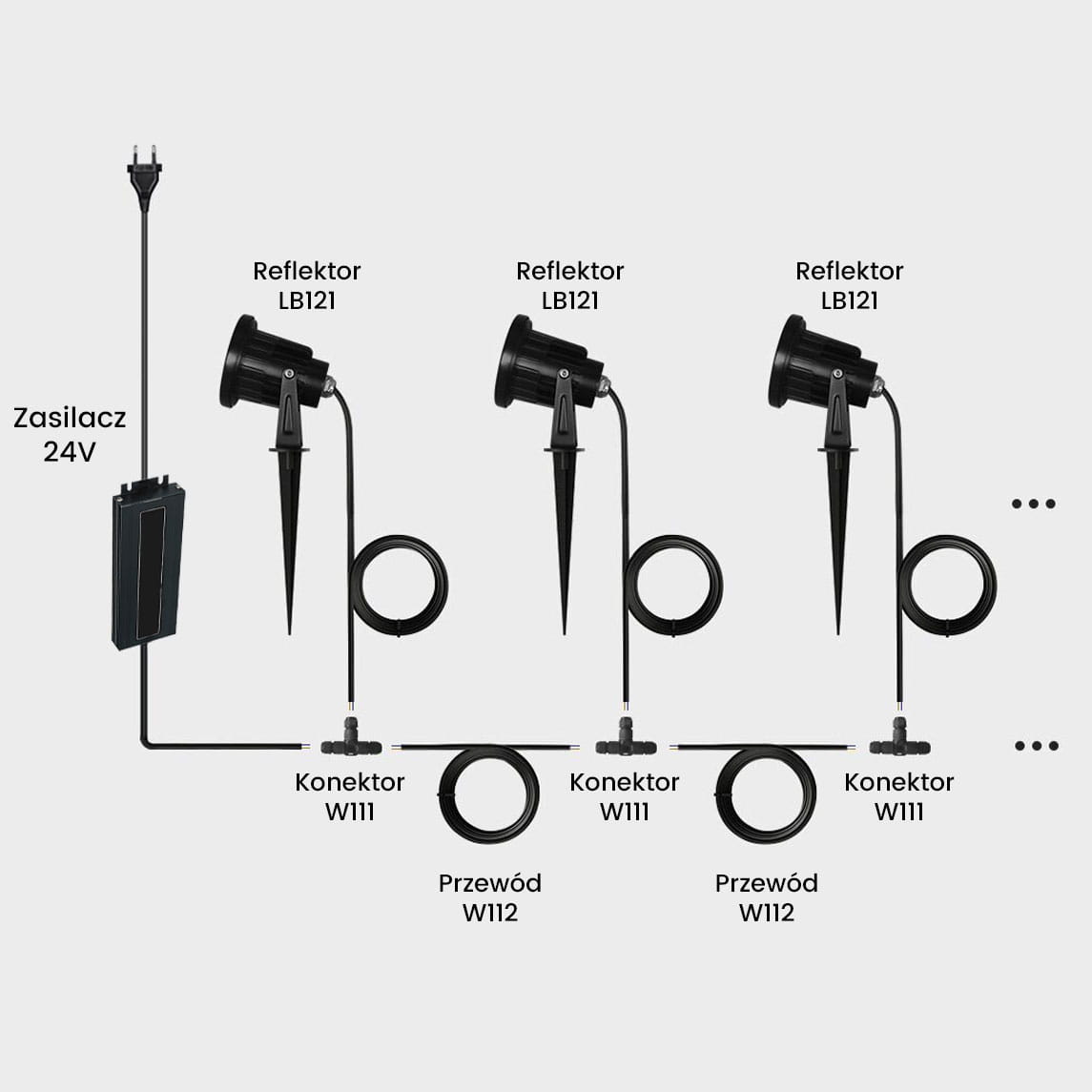 Schemat podłączenia lamp ogrodowych i wykorzystania konektorów: