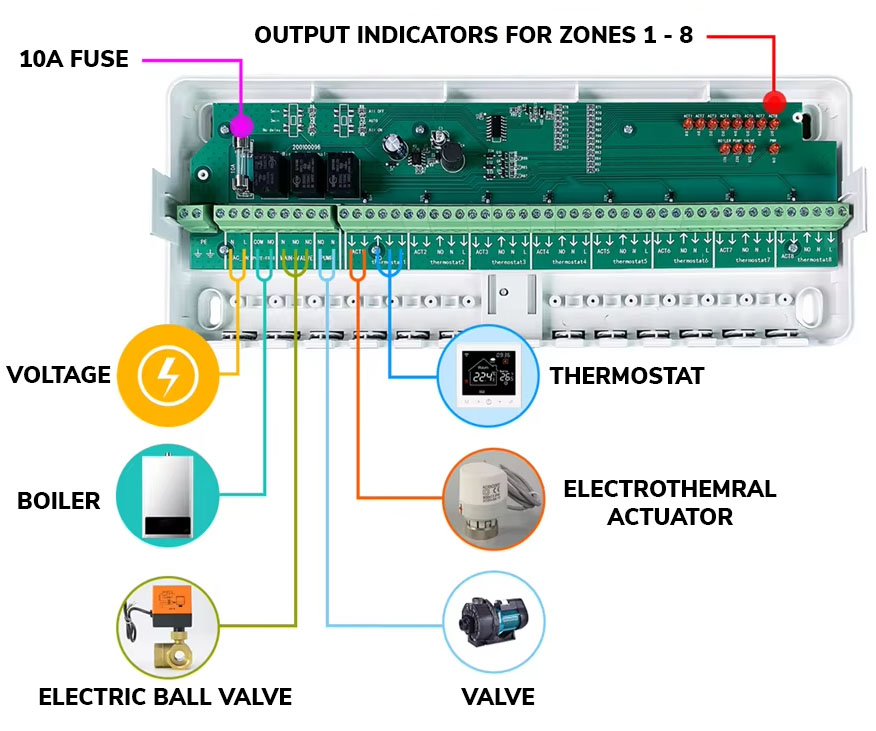 - ✅ Pewna integracja: Każdy termostat łączysz z odpowiednią sekcją za pomocą okablowania.