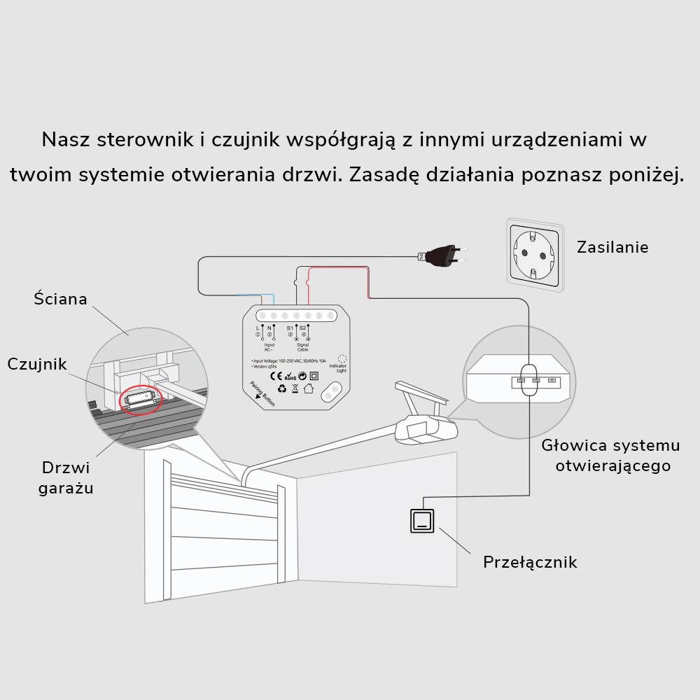 Smart Garage Door Opener to urządzenie towarzyszące istniejącego przewodowego otwierania drzwi garażowych. Jego główna zasada działania jest następująca: