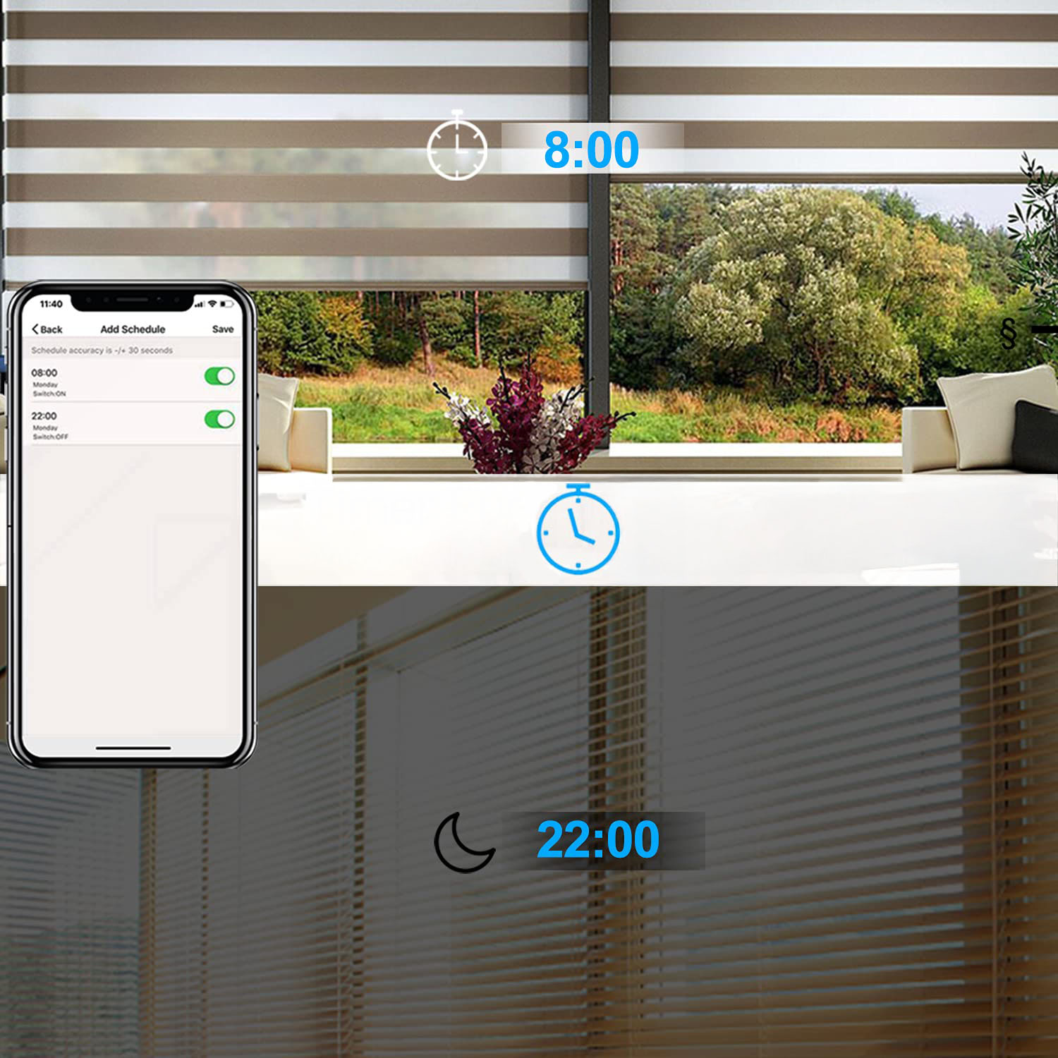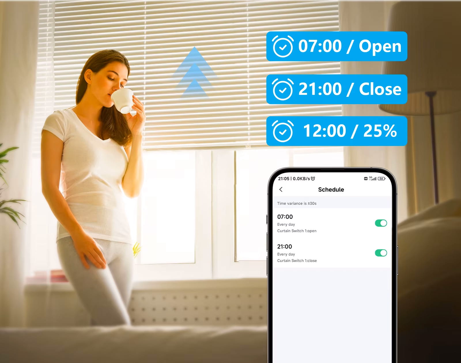 ✅ Automatyzacja i harmonogramy: zaplanuj godziny otwierania i zamykania rolet, dopasowując je do swojego stylu życia. Pobudka z naturalnym światłem? Żaden problem.