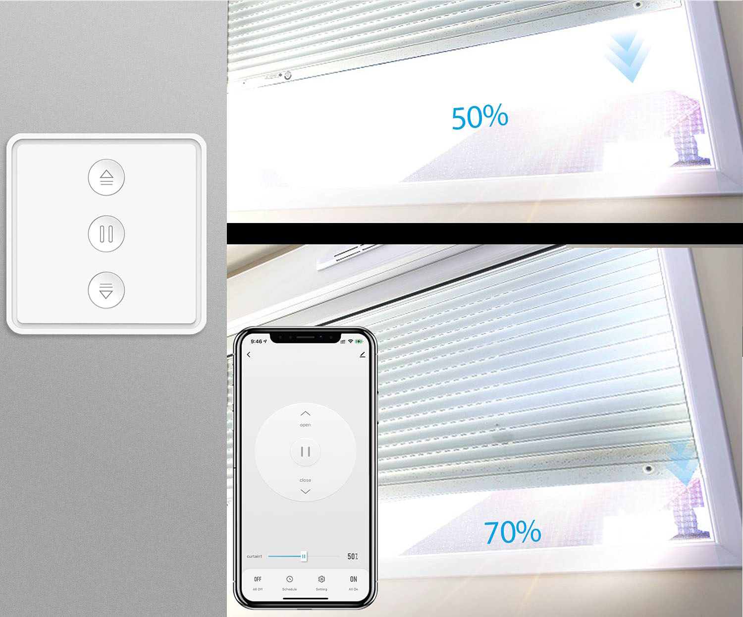 ✅ Kompatybilność z systemami Smart Home: działa z Asystentem Google i Amazon Alexa, więc możesz sterować roletami wygodnie za pomocą komend głosowych.