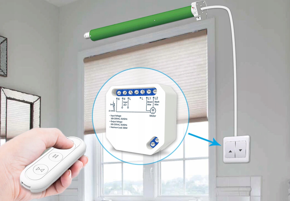 Przewód neutralny silnika jest wymagany, zwykle kolor przewodu neutralnego jest niebieski, proszę nie instalować przełącznika z dowolnym silnikiem DC (5-24V). Sterownik wymaga napięcia wejściowego 100-250 V.