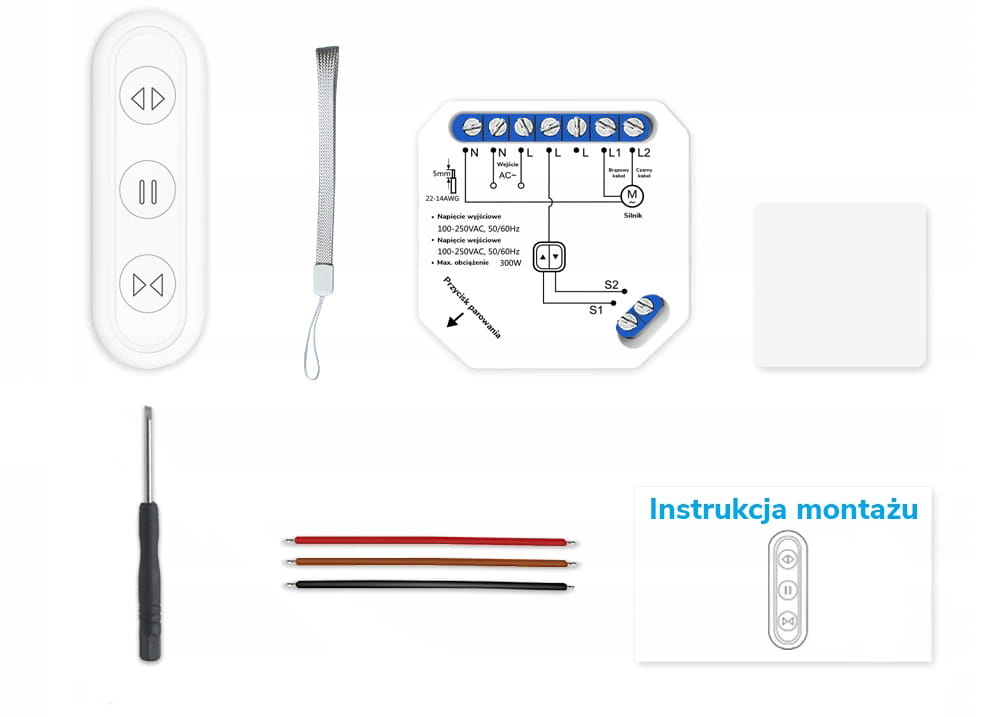 - Poprzez pilot RF (funkcja otwórz — wstrzymaj — zamknij) pilot działa w trybie offline, podczas gdy mamy problemy z siecią WiFi - zasięg działania to 30 m.