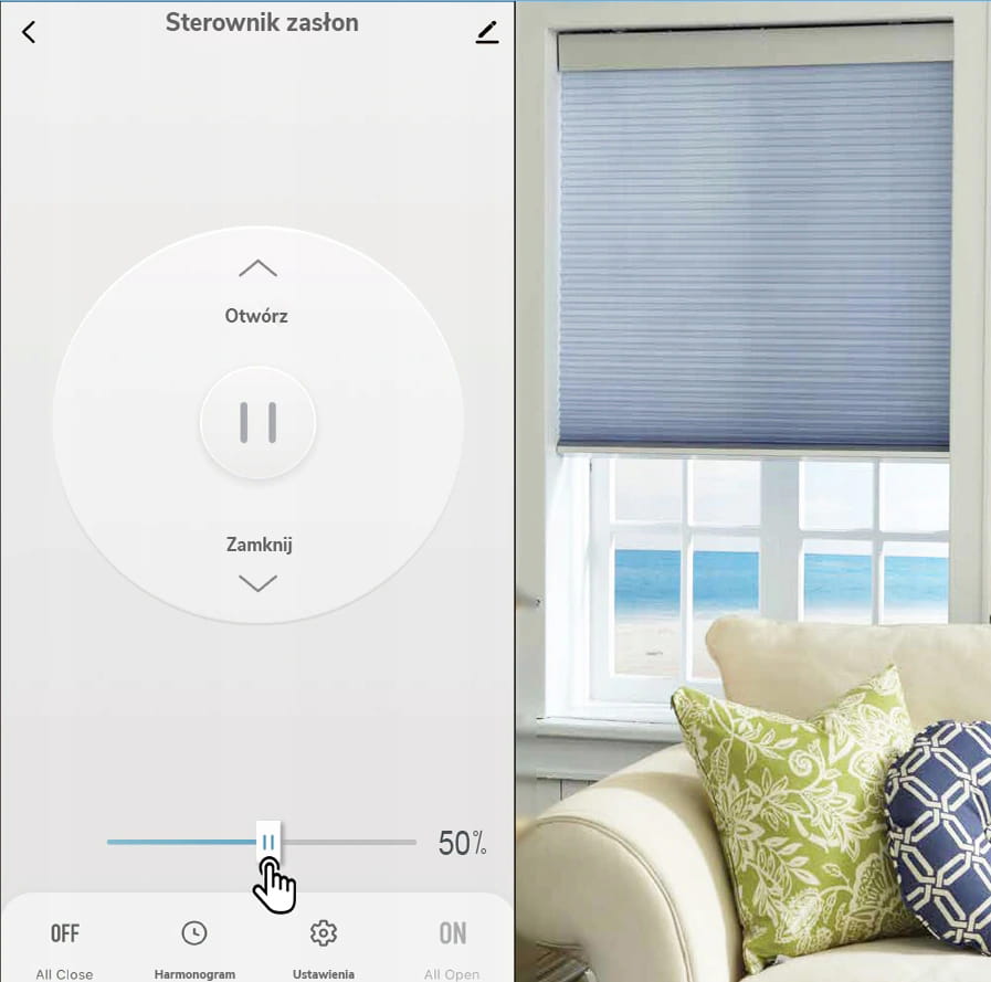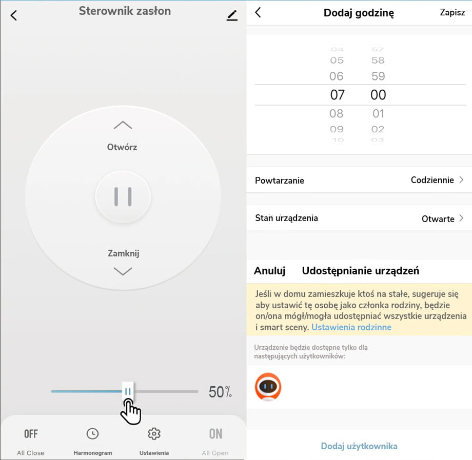 - Ustawienie harmonogramu czasowego (kiedy otworzyć lub kiedy zamknąć roletę)
