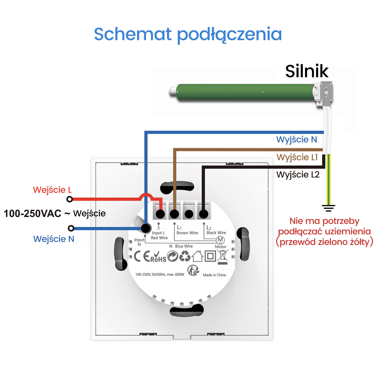 - Okablowanie: przewód neutralny, L1, L2, przewód uziemiający