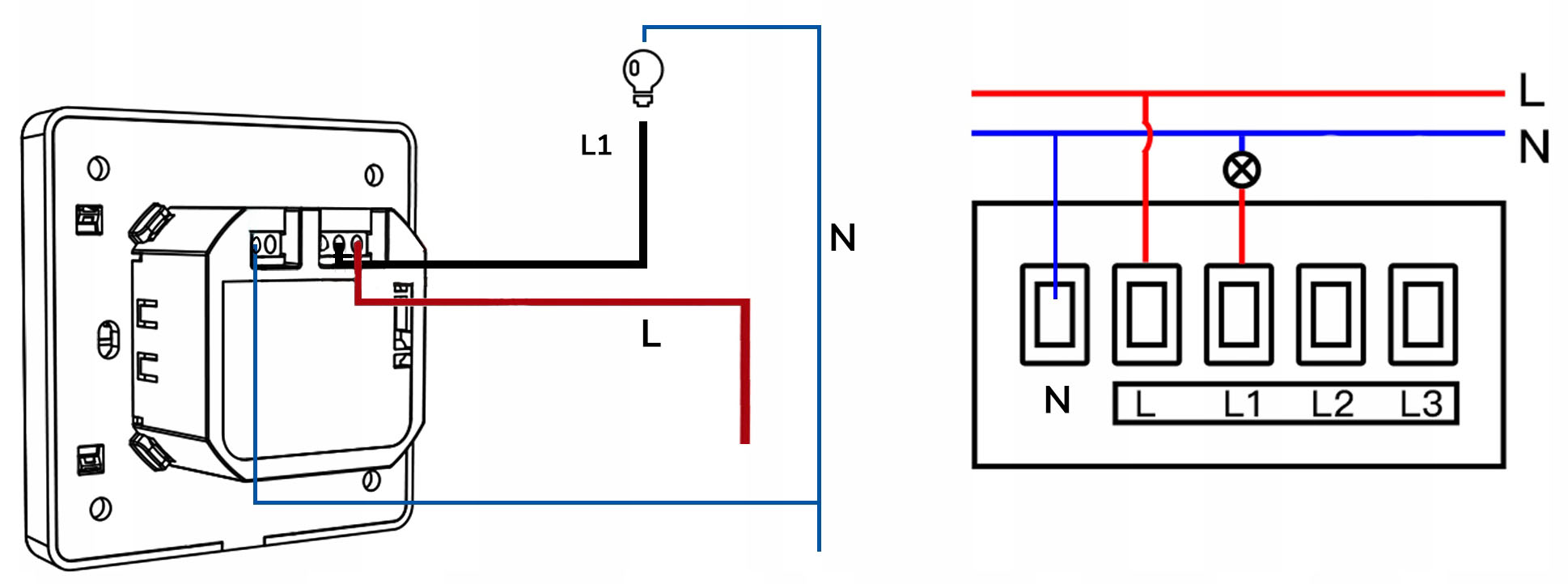 - Zacisk L1 (Wyjście/Load): Przewód fazowy sterowany, wychodzący bezpośrednio do odbiornika energii (np. żarówki lub oprawy oświetleniowej).