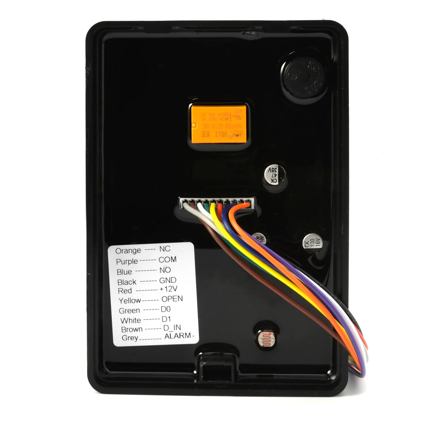 - Połączenia przewodów: wyjście przekaźnika, przycisk wyjścia, alarm, styk drzwiowy, wejście Wiegand, wyjście Wiegand