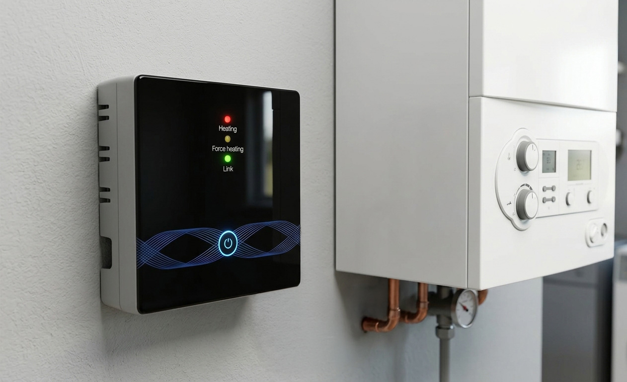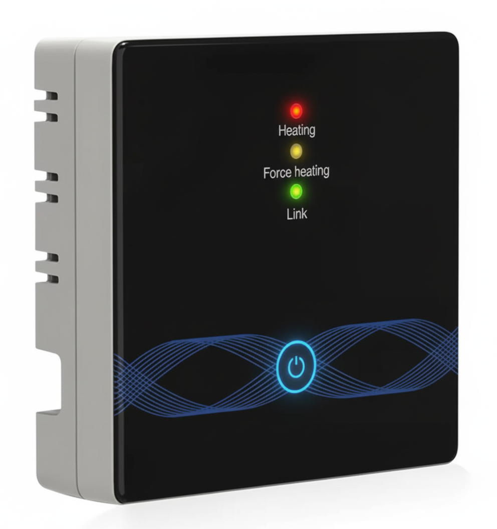 Bezprzewodowy odbiornik (jednostka wykonawcza), który pozwala sterować kotłem, pompą lub ogrzewaniem elektrycznym bez konieczności prowadzenia kabli do termostatu. Urządzenie odbiera sygnał radiowy z nadajnika i fizycznie włącza lub wyłącza system grzewczy, obsługując obciążenia do 3A (np. piece) lub 16A (np. maty grzewcze).