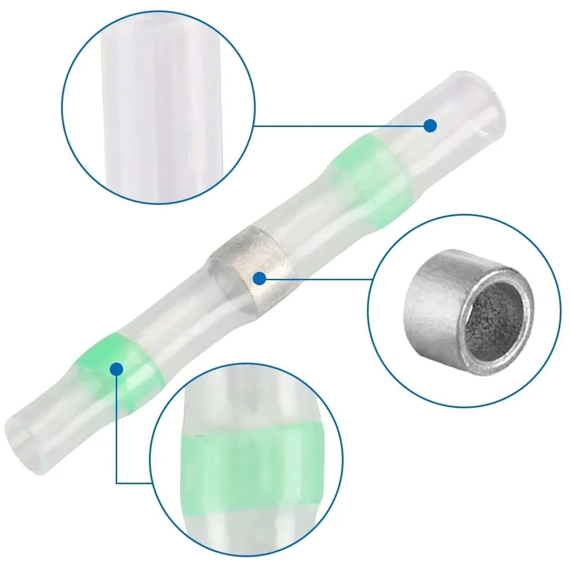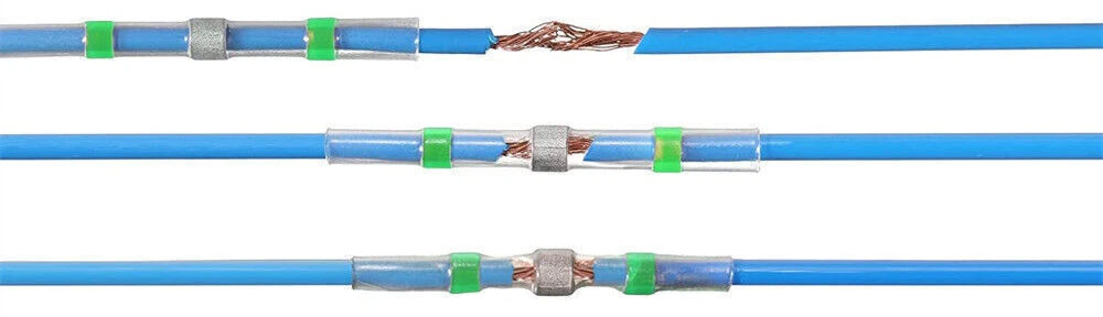 - Kolorowe pierścienie kleju na końcach, które topiąc się, gwarantują hermetyczność połączenia.
