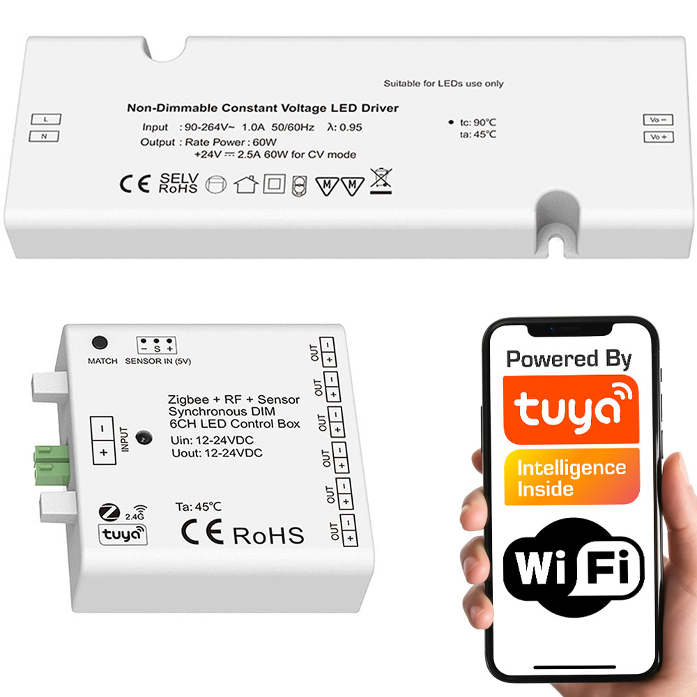 Zestaw Kontroler meblowy LED Mono 6CH Zasilacz 24V Seria SD WiFi RF TUYA