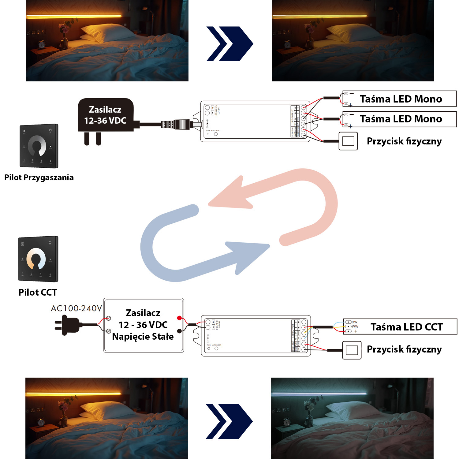 ▶️ Zasilacz SLIM ALU + Kontroler LED MONO CCT LC081 + Taśma LED SMD CCT 5m LD200