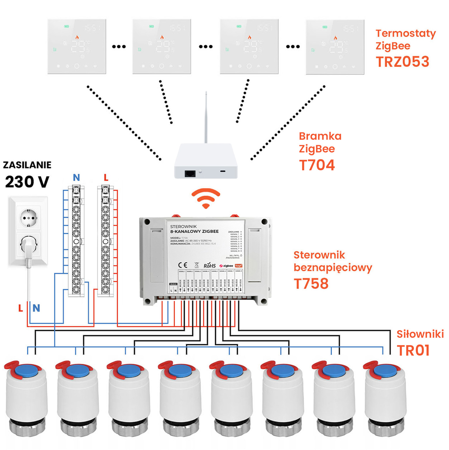 - ▶️ 4 x Siłownik termoelektryczny NC230V do połączenia z ogrzewaniem i sterownikiem