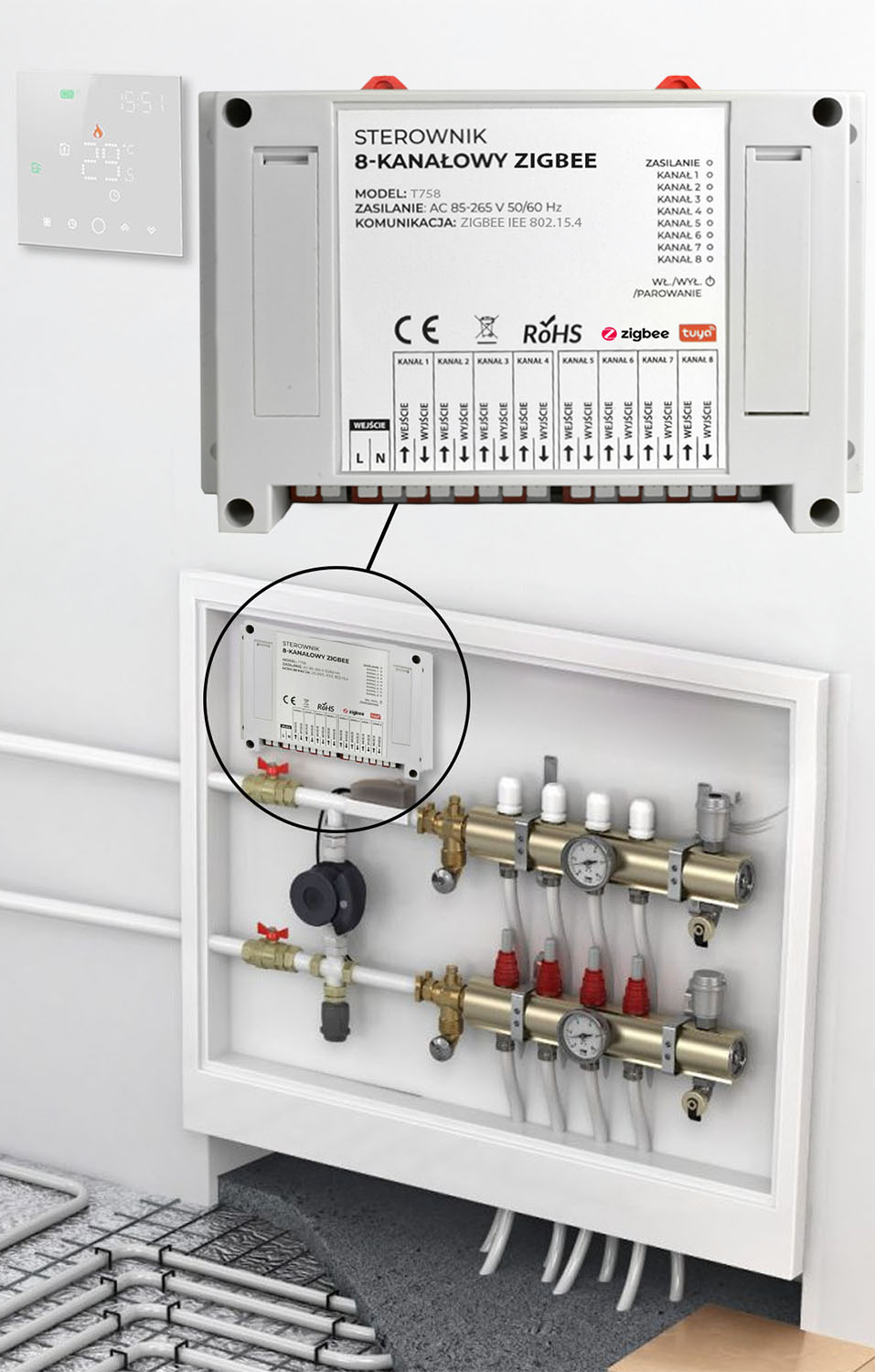 - Sterownik 8-kanałowy: Beznapięciowy moduł zarządzający strefami ogrzewania podłogowego.