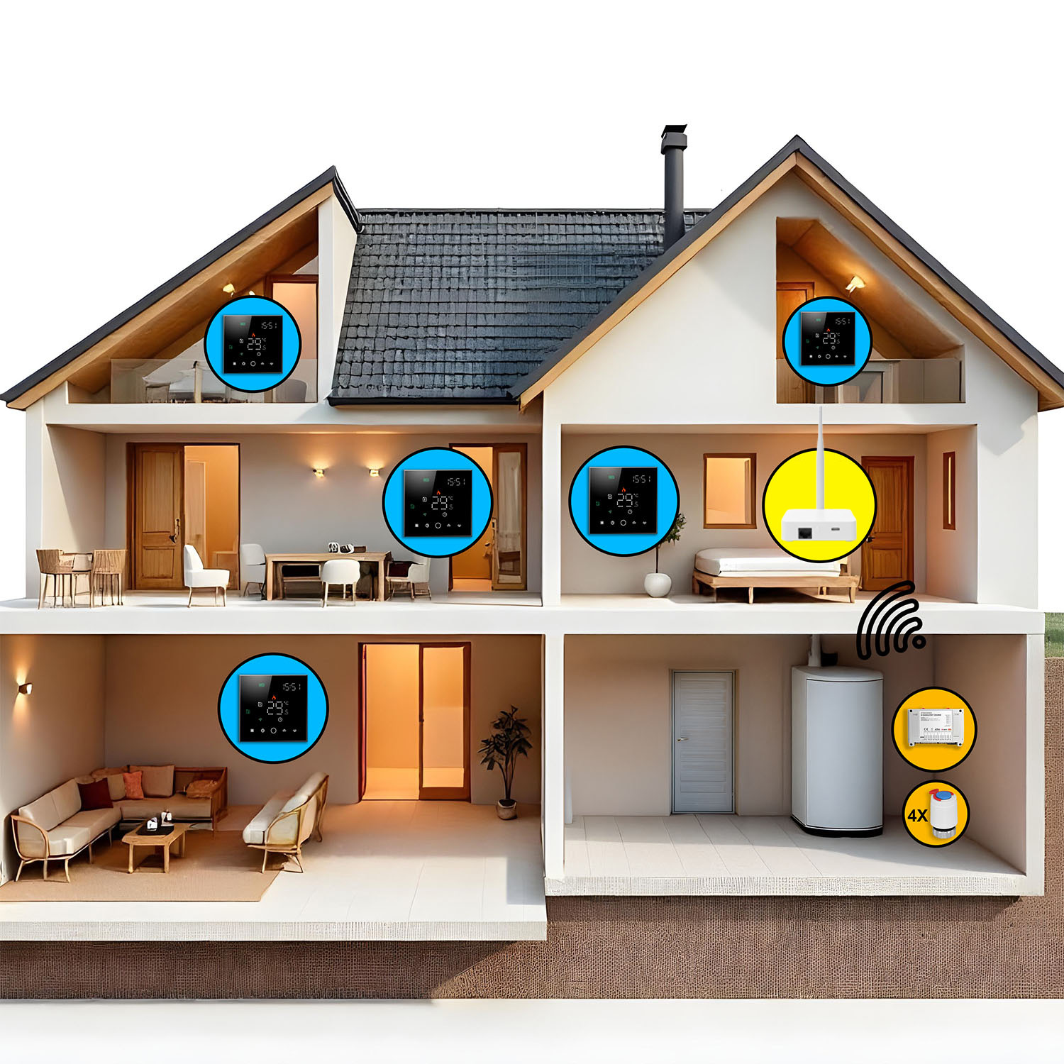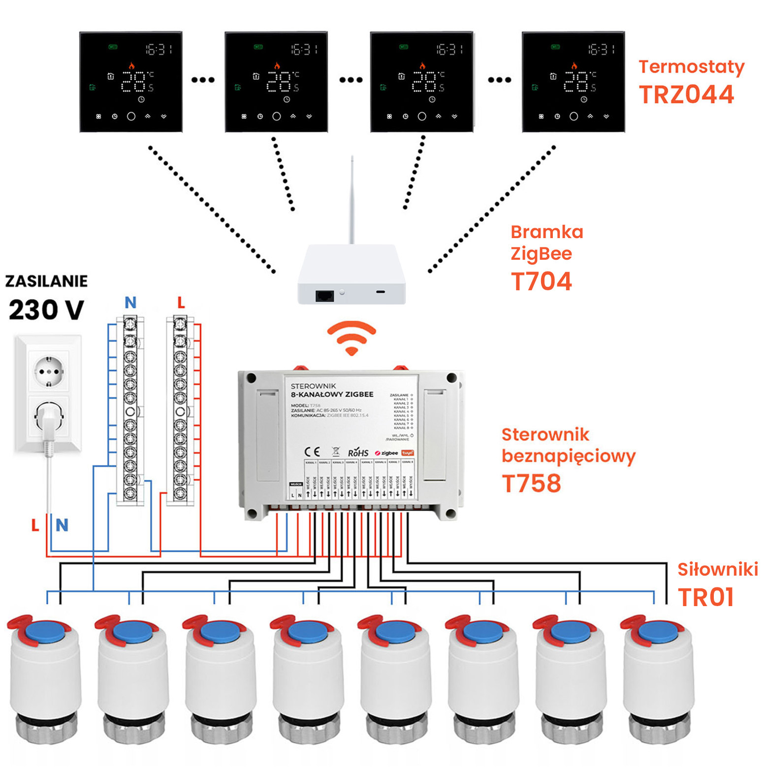 - ▶️ 4 x Siłownik termoelektryczny NC230V do połączenia z ogrzewaniem i sterownikiem