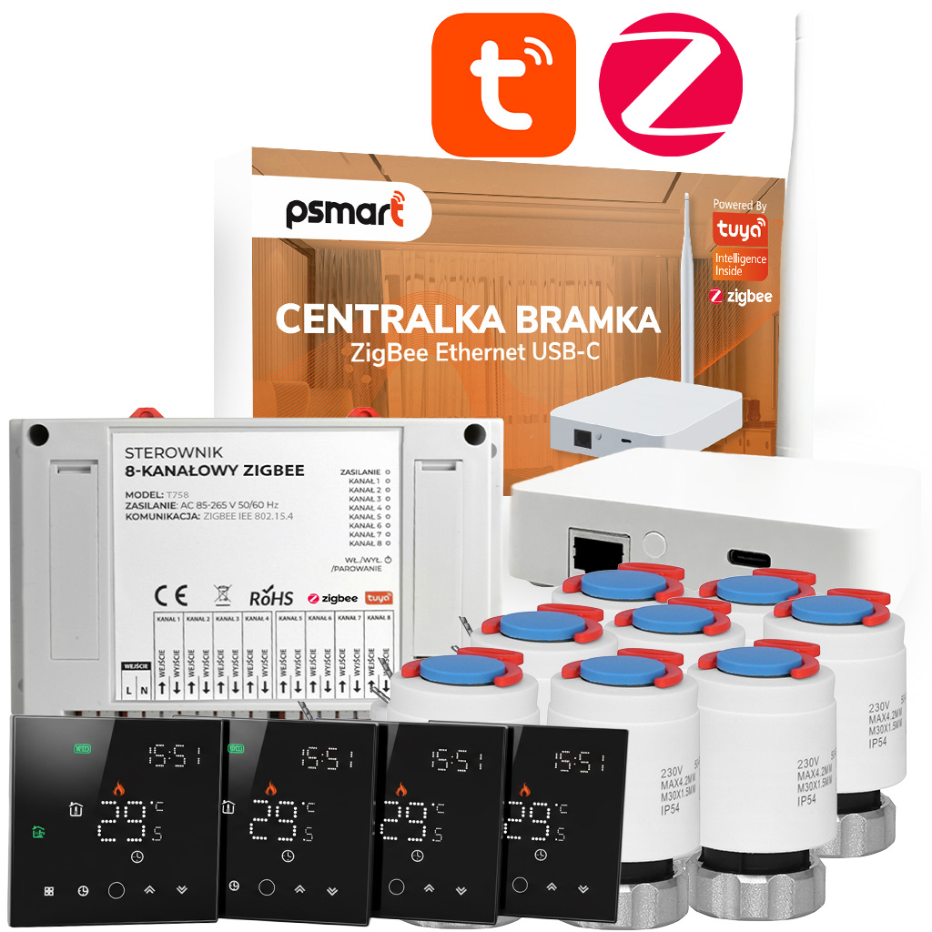 Zestaw do Ogrzewania Podłogowego 4x Termostat + 4 Siłowniki + 1x Centralka ZigBee TUYA